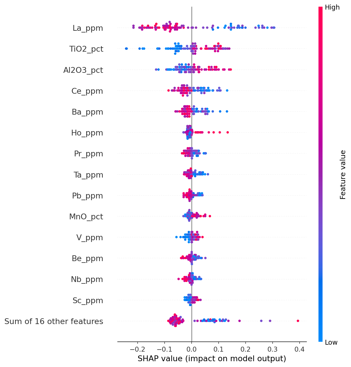 SHAP (SHapley Additive exPlanations) values quantify the contribution of each geochemical variable to every individual prediction. Rather than treating the model as a black box, SHAP decomposes each prediction so we can see if a given geochemical assay value pushed or pulled the model toward one group or the other. The beeswarm plot below summarises the summarises SHAP values across the entire training set. Each point is a sample, its position on the x-axis is its SHAP value with higher value pushing the model towards a prediction towards for the Caples Group, and lower values pulling the prediction towards the Other Sediment group. The colour of the point represents the value for that geochemical valiable (i.e. red points relatively high concetnrations with relatively low concentrations coloured blue).