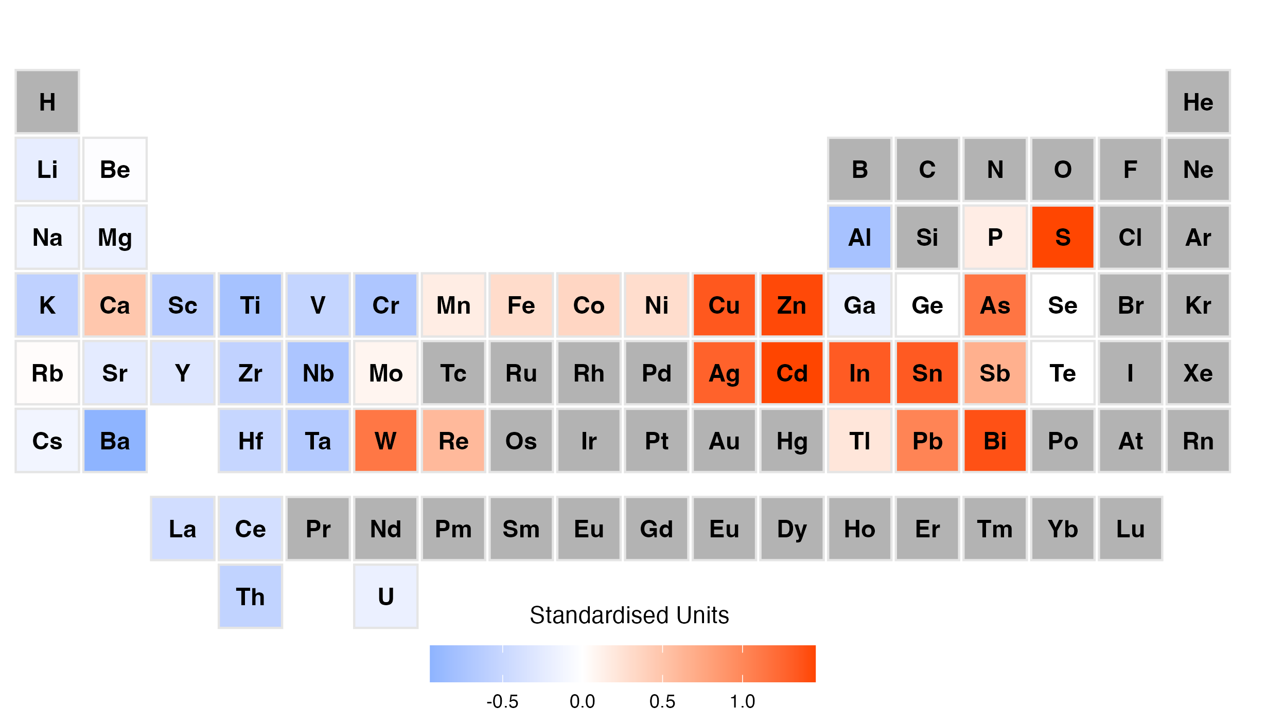 Analytics were then constructed for each clustered group in the interactive reports provided to the exploration team, allowing the geologists to put the geochemical results into a geological context, using their invaluable onsite domain knowledge. Below is a periodic tables for the mineralised samples loaded with Sn and associated elements.